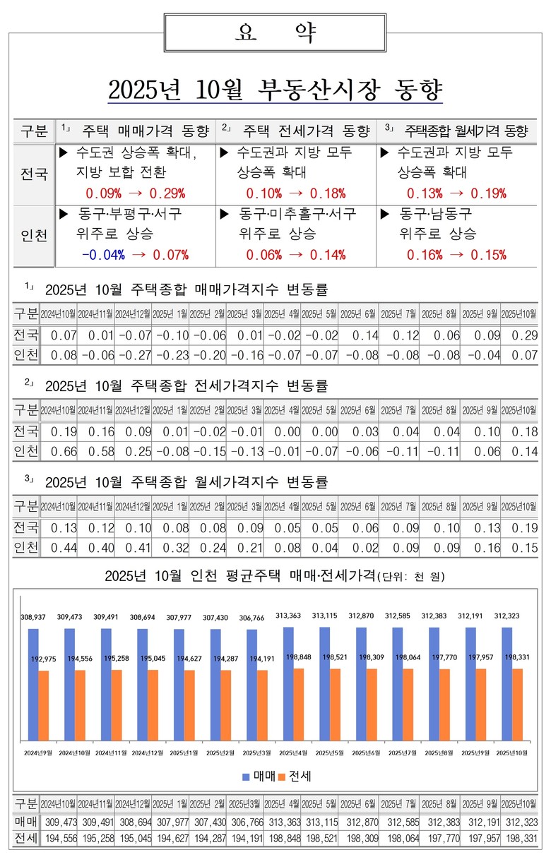 - 대출 규제 등 영향으로 전‧월세 상승 - [인천 세계타임즈=심하린 기자] 인천광역시(시장 유정복)는 인천 지역의 2025년 10월 주택 매매가격이 1년 만에 하락에서 상승으로 전환됐고, 전‧월세가격은 오름세를 보였다고 밝혔다.