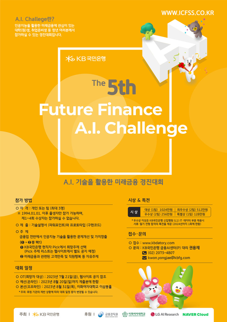 이번 공모전은 ‘금융업 전반에서 인공지능 기술을 활용한 문제개선 및 가치창출’을 주제로 총 6개팀에게 대상인 금융감독원상을 비롯한 최우수상·우수상 및 특별상이 수여될 예정이다. 총 상금은 약 2,700만원 규모로 우수상 이상 5개팀에는 KB국민은행 IT·데이터 부문의 채용지원 시 서류·필기 전형 면제 혜택이 주어진다.