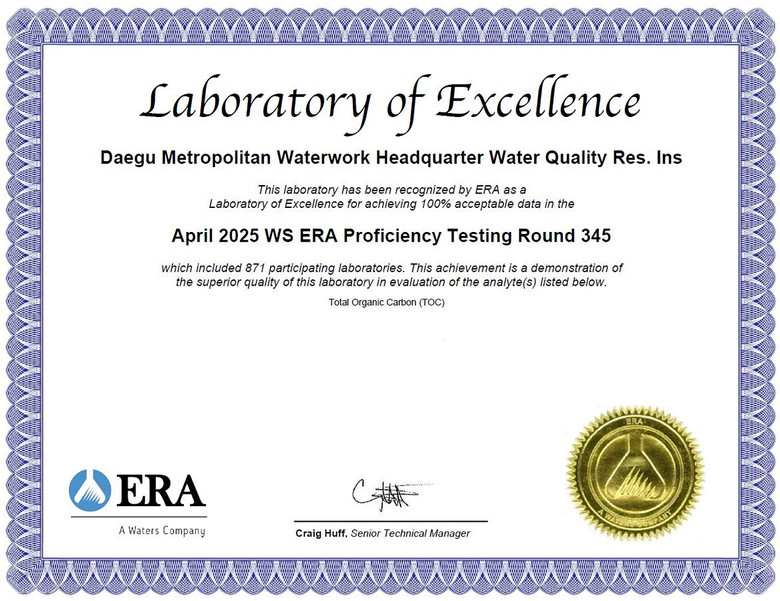 ▸ 정수장부터 수도꼭지까지 촘촘한 수질검사로 안전한 수돗물 공급 [대구 세계타임즈=한윤석 기자] 대구광역시 상수도사업본부 수질연구소는 2025년 미국환경자원협회(ERA, Environment Resource Associates)가 시행하는 국제숙련도 시험에 참가해 전 항목에서 모두 최고 등급인 ‘만족’ 판정으로 6년 연속 ‘최우수 분석기관’(Laboratory of Excellence)으로 인정받았다.