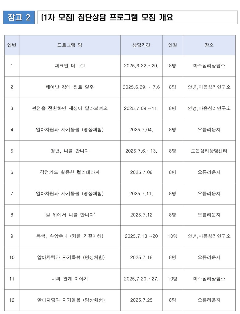 올해는 지난해 참여 청년들의 높은 호응을 반영해 지원 규모를 확대했다. 「일대일 심리상담」은 700명, 「집단 심리상담 프로그램」은 300명을 모집한다.