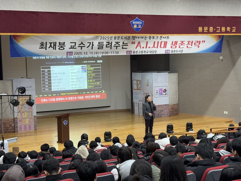 이날 강연에는 용문고등학교 학생 400여 명이 참여해 디지털 대전환 시대를 살아갈 청소년들의 미래 역량을 키우는 기회를 가졌다.