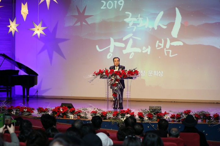 문 의장은 또 "오늘 시낭송의 밤 덕분에 2019년의 마지막 달을 시와 함께 시작하게 되어 감사하게 생각한다. 12월에 참 많은 일들이 있겠구나 짐작됩니다만, 오늘은 아름다운 시의 운율 속에서 문학의 향기에 취해보기를 권한다”고 말했다.