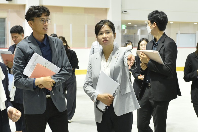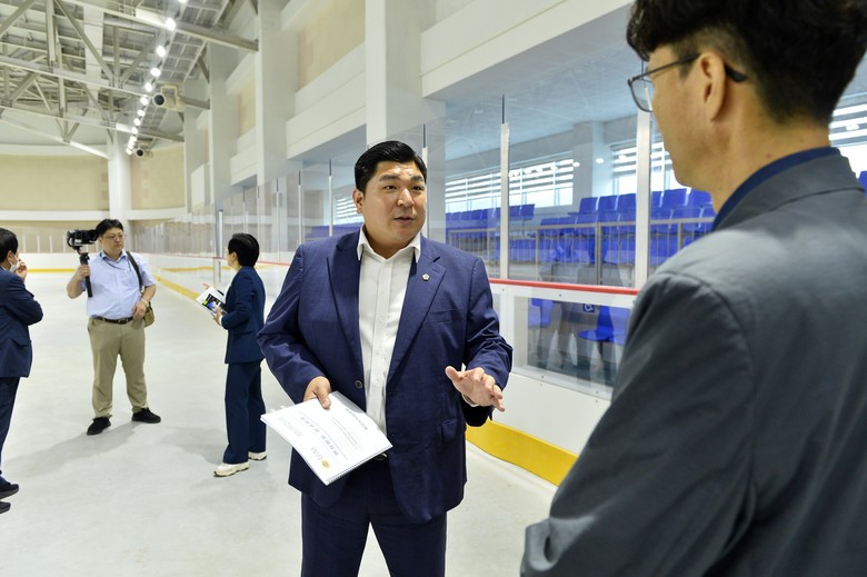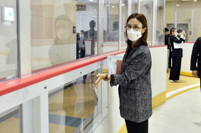 15일 오전 현장방문 첫 일정으로 반다비빙상장을 찾은 위원들은 소관 부서 담당자 및 수탁사(메이저스포츠산업)로부터 시설 현황 및 빙상장 개장 준비 상황 등 주요 현황에 대해 청취하고, 이에 따른 질의·응답시간을 가졌다.