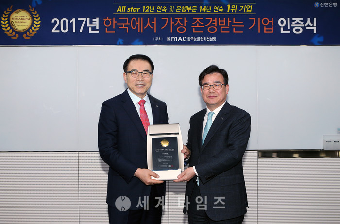 [세계타임즈 김장수 기자] 신한은행은 한국능률협회컨설팅 선정 ‘2017 한국에서 가장 존경받는 기업’조사에서 12년 연속 All star(전체기업 중 상위 30위 기업) 및 14년 연속 은행산업부문 1위 기업으로 선정됐다고 밝혔다.