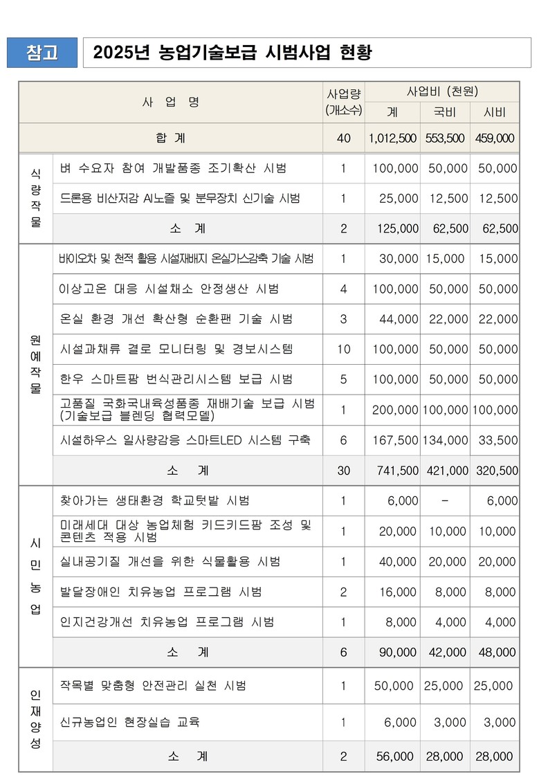 분야별로 ▲[식량작물] ‘벼 수요자 참여 개발품종 조기 확산 시범’ 등 2개 사업 ▲[원예작물] ‘시설하우스 일사량 감응 스마트 엘이디(LED) 시스템 구축’ 등 7개 사업 ▲[시민농업] ‘발달장애인 치유농업 프로그램 시범’ 등 5개 사업 ▲[인재양성] ‘작목별 맞춤형 안전관리 실천 시범’ 등 2개 사업을 시행한다.