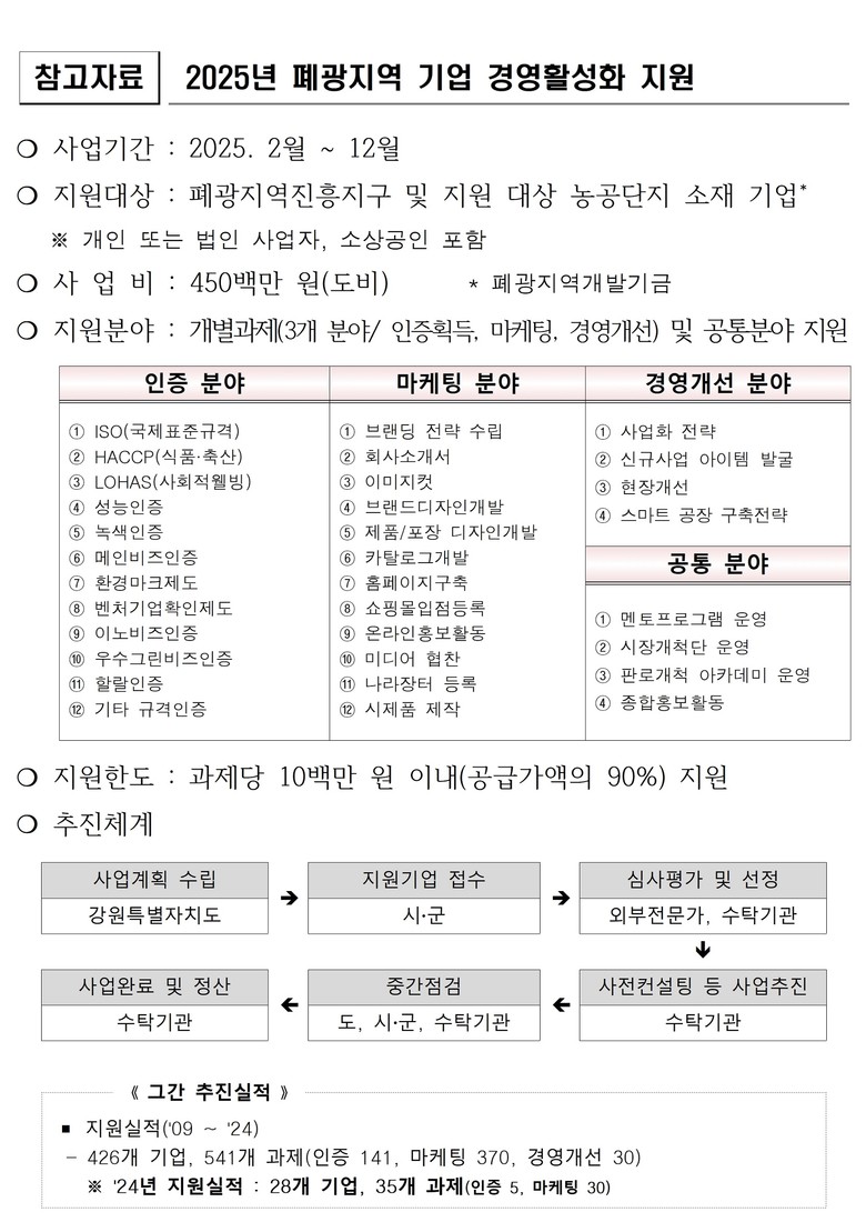 [강원도 세계타임즈=김민석 기자] 강원특별자치도(도지사 김진태)는 폐광지역진흥지구 및 폐광지역 지원 대상 농공단지 입주기업을 대상으로 추진 중인 「2025년 폐광지역 기업 경영활성화 지원사업」의 선정 결과를 발표하고, 본격적인 사업 지원에 나선다고 밝혔다.