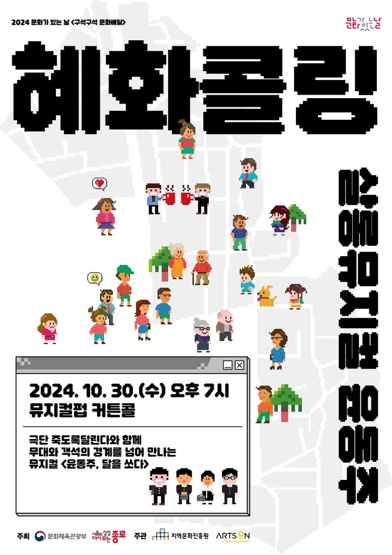[혜화콜링=세계타임즈 이상호 기자] 문화체육관광부와 종로구가 주최하고 지역문화진흥원, ㈜아츠온 이 주관하는 <2024 문화가 있는 날 구석구석 문화배달 “혜화콜링”/이하 구석구석 문화배달 “혜화콜링”>이 오는 10월 마지막 프로그램으로 뮤지컬펍 커튼콜에서 <살롱뮤지컬 윤동주>를 개최한다.
