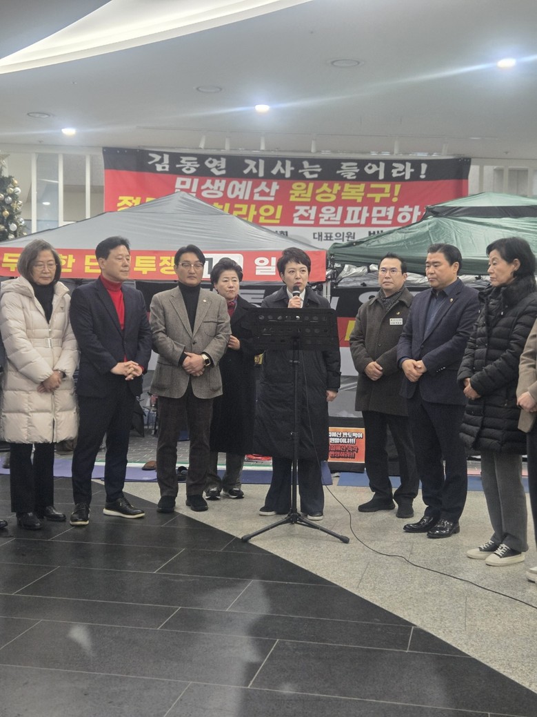 송언석 국민의힘 원내대표와 김은혜 국회의원은 김동연 지사의 민생예산 삭감과 조혜진 비서실장을 비롯한 정무 라인의 행정사무감사 거부에 맞서 지난달 25일부터 백현종 경기도의회 국민의힘 대표의원의 삭발과 단식을 시작으로 본격 투쟁에 나선 국민의힘 의원들을 격려했다.
