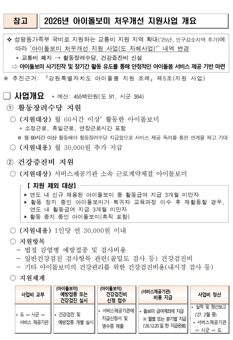 도는 2023년부터 자체사업으로 아이돌보미 활동 여건 개선을 위해 교통비(1일 1회, 1,500원)를 지원해 왔으나, 2025년부터 성평등가족부(국비) 교통비 지원 대상이 인구감소지역까지 확대됨에 따라, 도 사업을 활동장려수당과 건강증진비를 신설하여 지원하는 방식으로 보다 실효성 있는 정책으로 전환해 아이돌보미 처우개선을 강화하고자 한다.