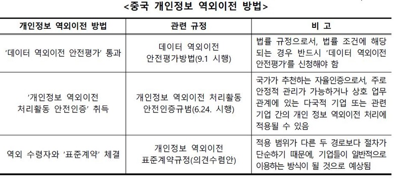 아울러, 중국 정부는 개인정보 및 데이터 역외이전 시 처리 규모, 중요도 등으로 분류하여 역외이전 규제방법 및 절차를 각각 달리하고 있어 중국 소재 한국기업들의 준법경영에 어려움이 가중되고 있다.