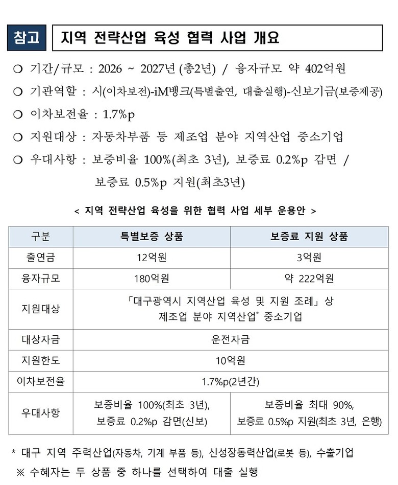 협약에 따라 iM뱅크는 신보에 총 15억 원(특별출연금 12억원, 보증료 지원금 3억원)을 출연한다. 신보는 이를 바탕으로 총 402억 원 규모의 ‘특별출연 협약보증’과 ‘보증료 지원 협약보증’을 공급한다. 대구시는 해당 대출금에 대해 연 1.7%p의 이차보전을 2년간 지원해 기업의 실질적인 금융 부담을 낮춘다.