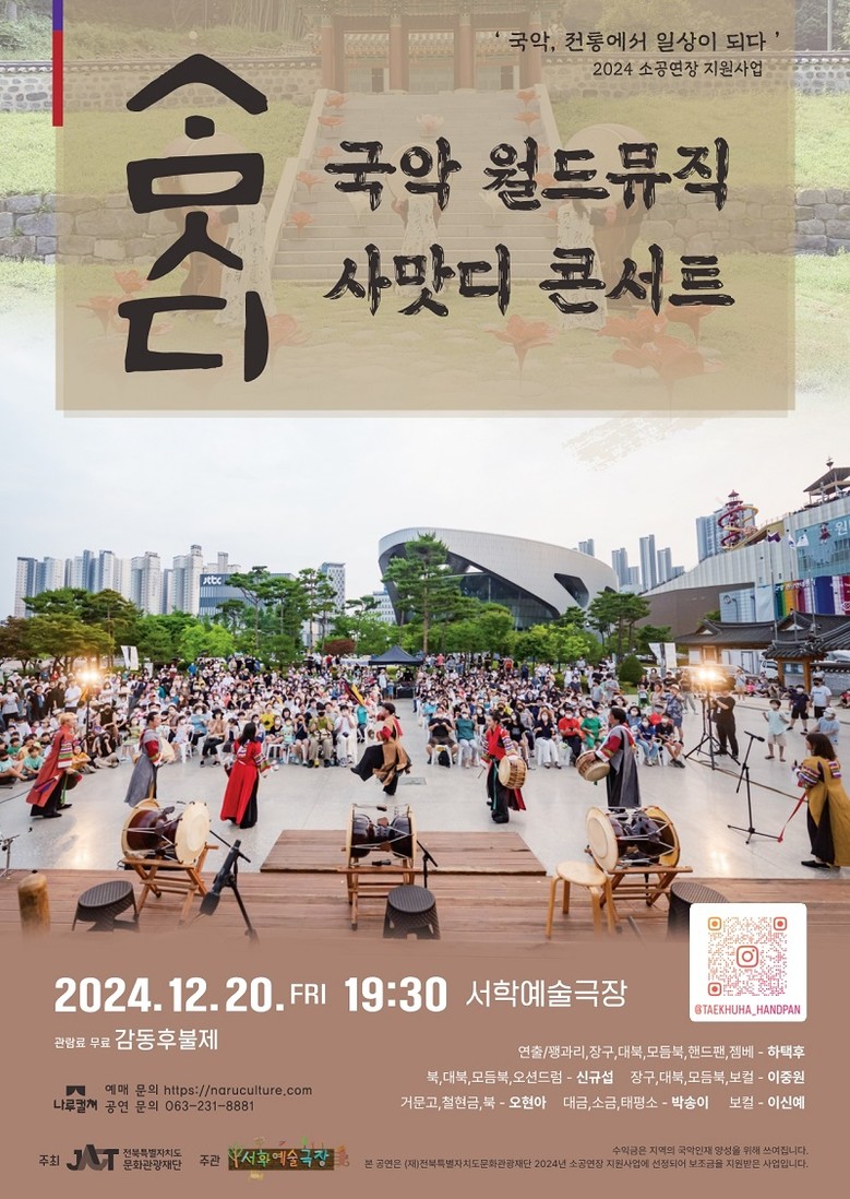 12월 20일은 타악 프로젝트 그룹 ‘사맛디’가 준비한 ‘국악 월드뮤직 사맛디 콘서트’가 무대에 오른다. 국악 타악과 함께 세계의 다양한 악기와 장르를 화려하게 넘나드는 공연으로, 서학예술극장 기획 공연 시리즈 ‘국악, 전통에서 일상이 되다’의 피날레를 장식한다.