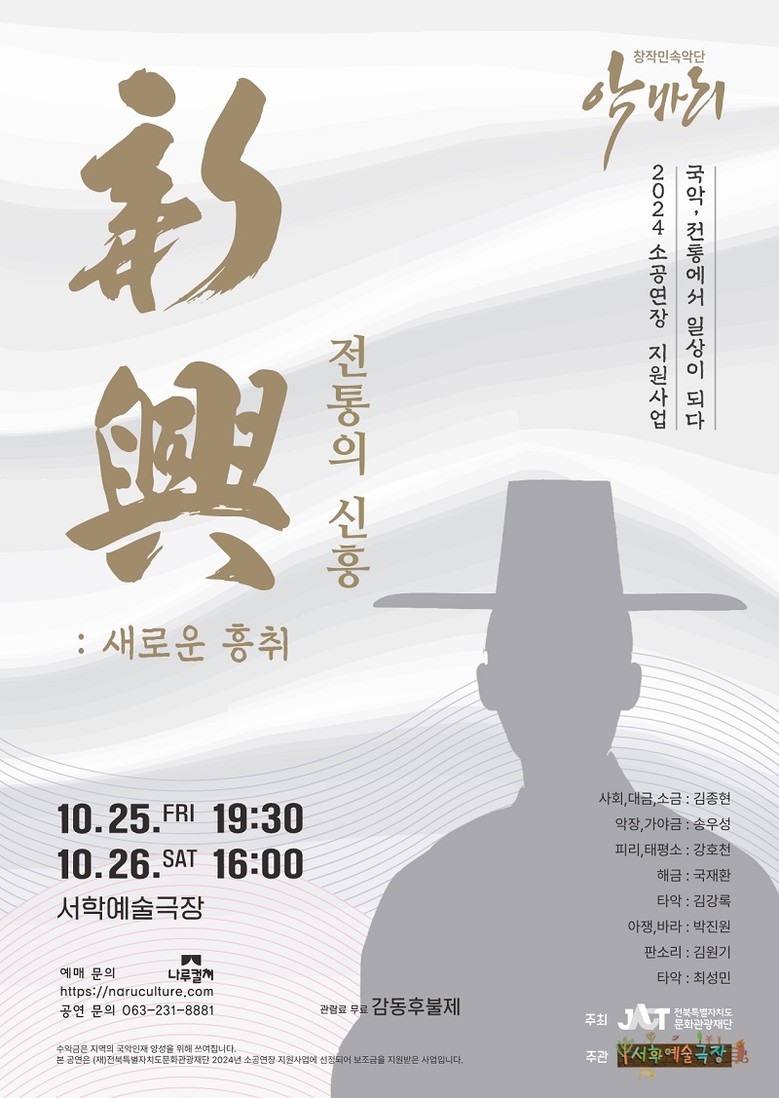 [전북특별자치도문화관광재단=세계타임즈 이상호 기자] 전북특별자치도문화관광재단(대표이사 이경윤, 이하 재단)이 운영하는 ‘2024 소공연장 지원사업’의 성과로 전북 고유의 문화예술 자원을 활용한 콘텐츠가 7월 5일부터 도민에게 찾아온다. 바로 서학예술극장(대표 이여송)이 준비한 전통예술 기획 공연 시리즈 ‘국악, 전통에서 일상이 되다’가 그 주인공이다.