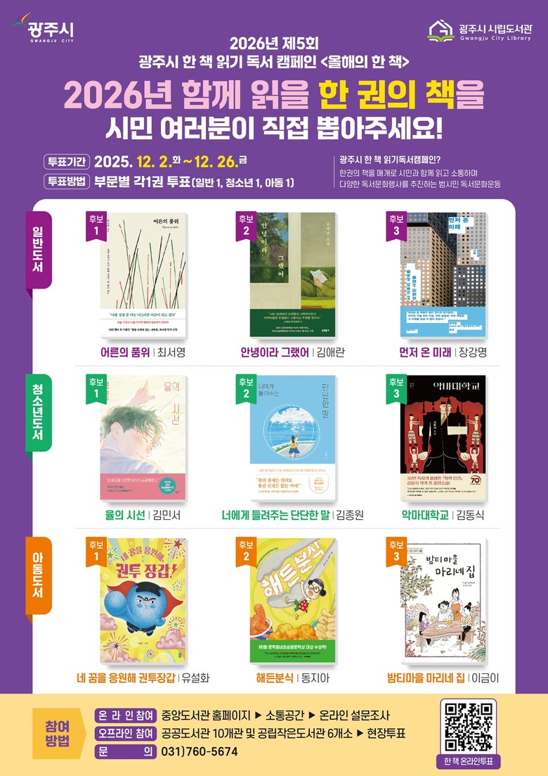 시민 투표 결과 각 부문별 최종 선정된 도서는 2026년 한 해 동안 광주시 전 공공도서관에 비치되며 작가와의 만남, 독후감 대회 등 다양한 독서 문화 프로그램과 연계해 운영될 예정이다.