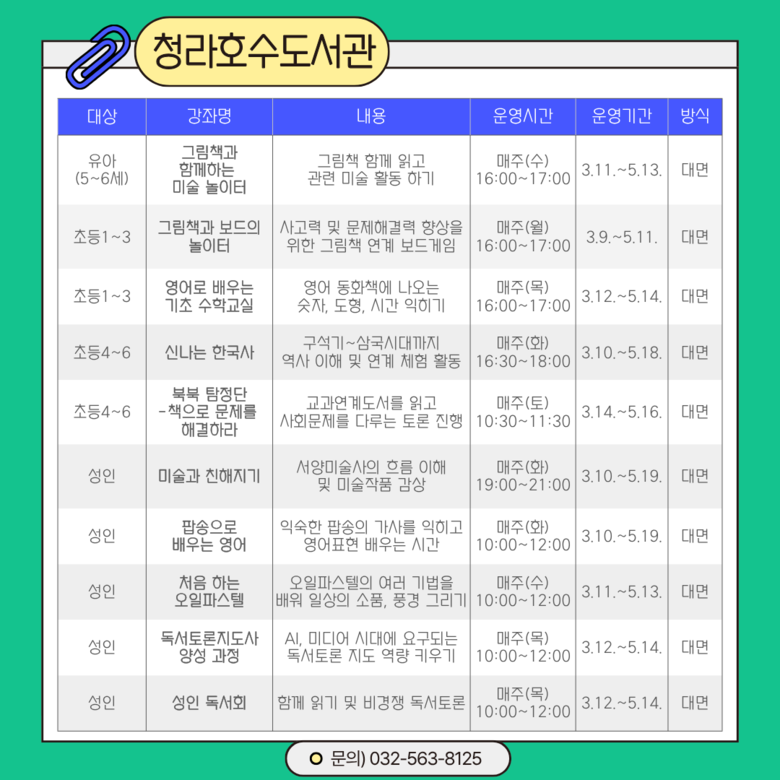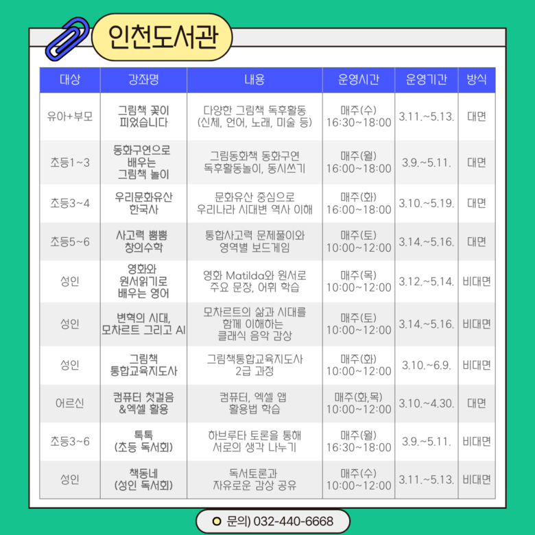 이번 상반기에는 총 43개 강좌가 운영된다. 도서관별로는 ▲인천도서관 ‘그림책 꽃이 피었습니다’등 10개 강좌 ▲청라호수도서관 ‘북북 탐정단-책으로 문제를 해결하라’ 등 10개 강좌 ▲청라국제도서관 ‘책이랑 과학할 랩(Lab)’ 등 7개 강좌 ▲영종하늘도서관 ‘창의수학보드’등 9개 강좌 ▲마전도서관 ‘영어 동화 함께 읽기’ 등 7개 강좌를 마련했다.