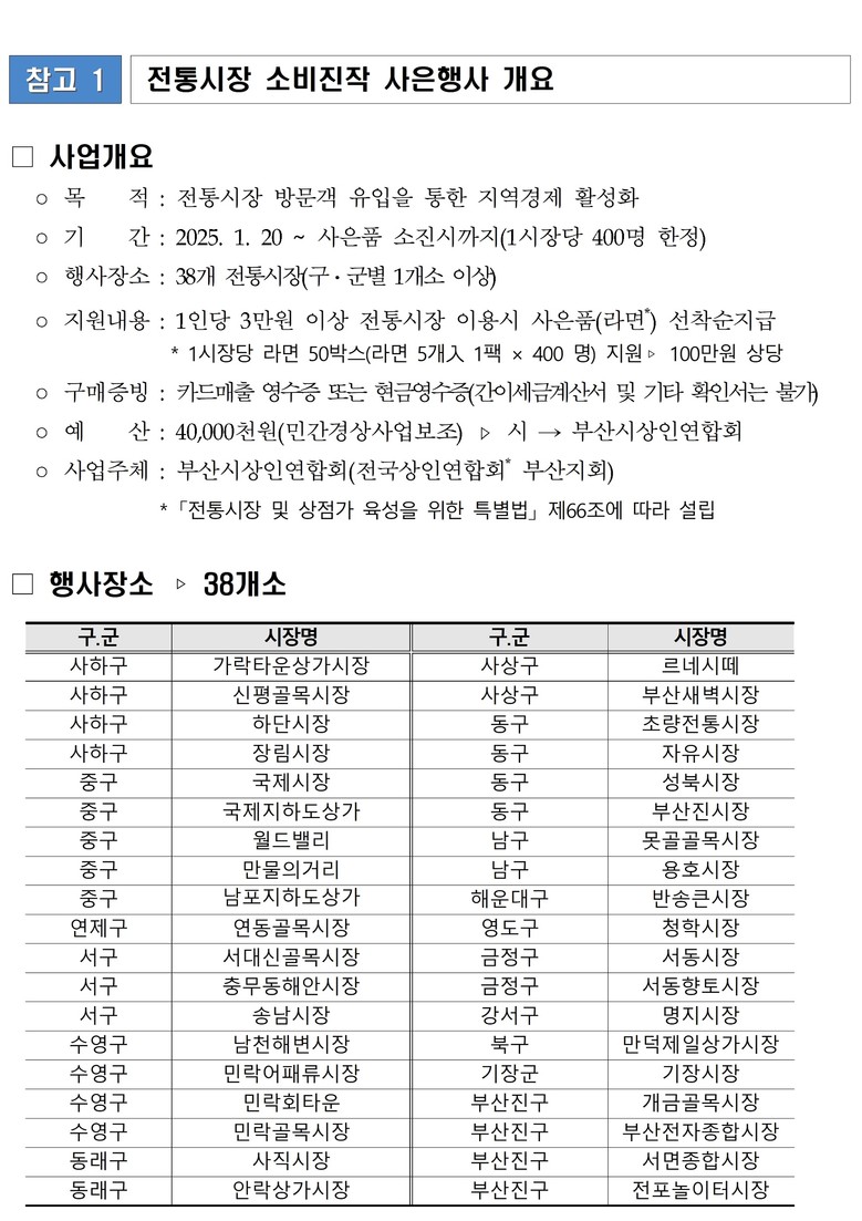 내일(20일)부터 시역내 38개 전통시장(구·군별 1곳 이상)에서 3만 원 이상 구매한 고객(선착순 400명)에게 사은품(라면 1팩)을 증정한다.