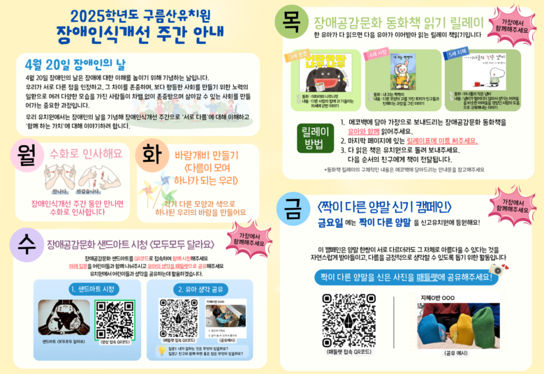 화요일에는‘다름이 모여 하나 되는 우리’라는 상징적인 메시지를 담은 바람개비 만들기를 하였고, 수요일에는 가정과 함께 샌드아트 ‘모두모두 달라요’시청하기를 하였다. 목요일에는 가정과 연계된 장애공감문화 동화책읽기 릴레이를 하였고, 금요일에는 ‘짝이 다른 양말 신기’ 캠페인을 해보았다.