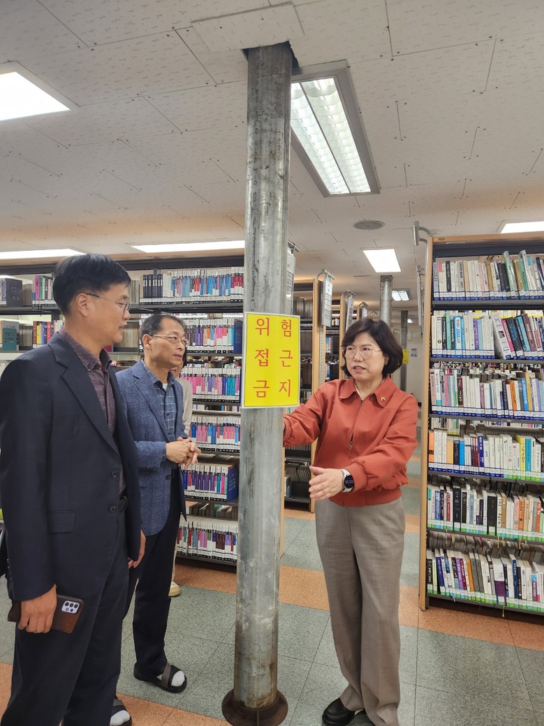 이어 이애형 위원장은 같은 날 경기도교육청중앙도서관을 방문하여, 최근 정밀안전진단 결과 ‘D등급’을 받은 건물의 구조적 안전성과 임시 보강조치 현황을 직접 확인하였다.