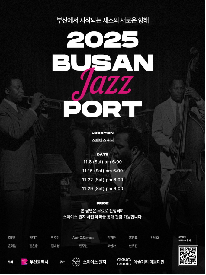 ◈ 공연은 무료로 관람할 수 있으며, 네이버 사전예약(스페이스 원지)으로 참여 가능 [부산 세계타임즈=이용우 기자] 부산시(시장 박형준)는 바다와 도시가 어우러진 부산 도시의 정체성과 재즈음악을 결합한 '부산항과 재즈의 만남(BUSAN JAZZ PORT)'을 주제로 11월 한 달간 매주 토요일 재즈 기획공연을 개최한다고 밝혔다.