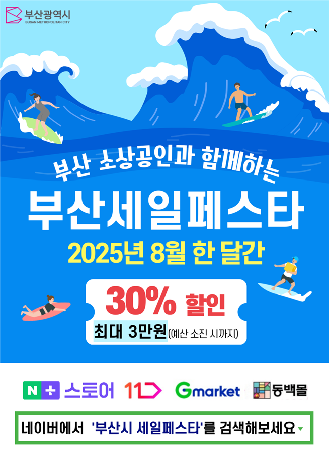 ◈ 지역 우수 제품의 전국 홍보 및 브랜드 인지도 제고와 실질적인 매출 증가 기대 [부산 세계타임즈=이용우 기자] 부산시(시장 박형준)는 8월 한 달간 국내 주요 온라인몰인 ▲네이버 ▲11번가 ▲지마켓(G마켓) ▲동백몰에서 「부산세일페스타(온라인)」 특별할인전으로 30퍼센트(%) 할인 쿠폰을 제공한다고 밝혔다.