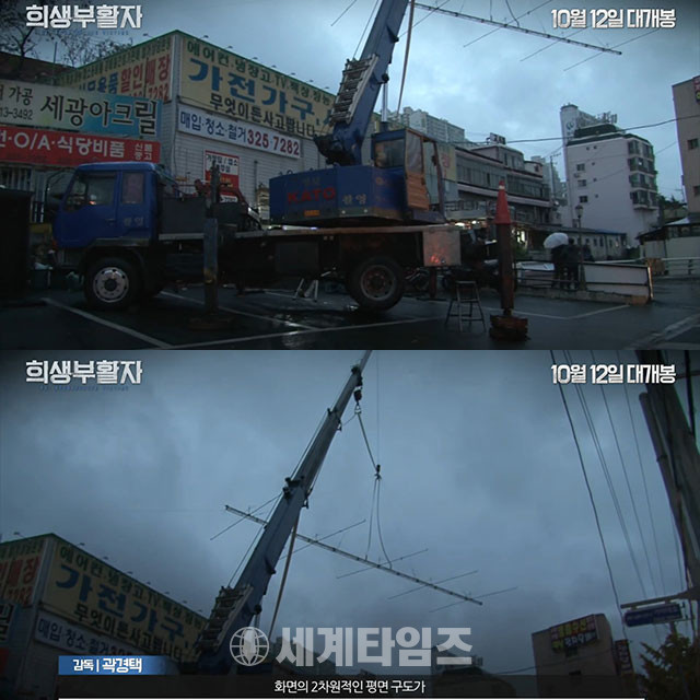 영화 '희생부활자' 제작 증언 영상에서는 부산 사상구 주례동에 위치한 신주례재활용센타 앞에 비를 내리기 위해 초대형 크레인 살수차가 동원된 장면이 공개됐다.