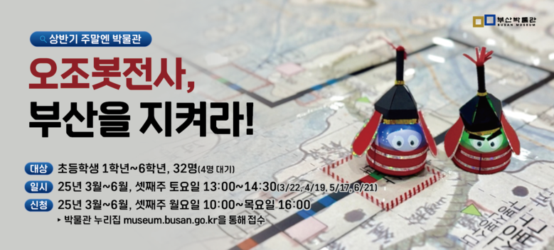 상반기 프로그램 「오조봇 전사, 부산을 지켜라!」는 부산박물관에서 2021년 가덕도 천성진성 제4차 발굴조사에서 나온 조선 후기 갑옷 ‘두정갑(頭頂甲)**’과 오는 4월부터 열리는 테마기획전 ‘갑 오브 갑(甲 of 甲), 부산 갑옷’(‘25.4.8.~5.11.)과 연계해 기획됐으며, 조선시대 갑옷과 부산의 관방*** 역사를 주제로 한다.