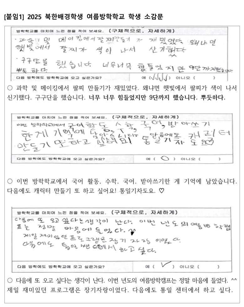 정근식 교육감은 “북한배경학생 방학학교는 단순한 학습 지원을 넘어, 한 아이가 스스로의 가능성을 발견하고 ‘할 수 있다’는 자신감을 회복하도록 돕는 교육”이라며, “앞으로도 학생 한 명 한 명의 성장 가능성을 존중하며 배움과 진로, 삶을 함께 지원하는 교육을 지속해 나가겠다”고 밝혔다.