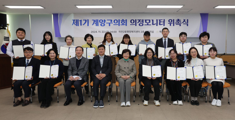 [계양구 세계타임즈=심하린 기자] 인천광역시 계양구의회(의장 신정숙)는 지난 22일 시민과 소통하는 의정활동을 위해 제1기 계양구의회 의정모니터 27명에 대한 위촉장 전달식을 가졌다.
