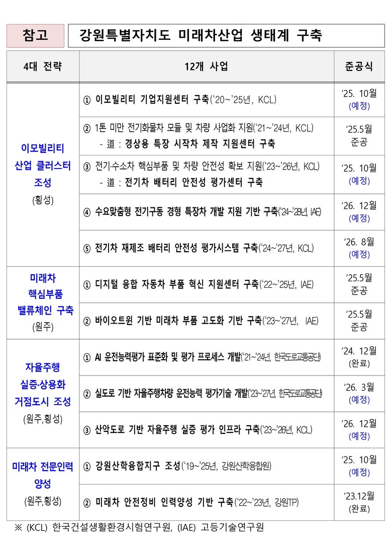또한 강원특별자치도는 미래차 산업 생태계 육성을 위해 4개 분야 12개 연구·실증 지원 인프라 국가전략사업을 확보, 원주·횡성을 중심으로 집적화 단지를 구축하고 있다. 민선 8기 취임 이후 3년 동안만 3개 사업을 준공 또는 완료하고 7개 신규 사업을 추가 확보( 총사업비 1,048억 원)하는 성과를 달성했다.