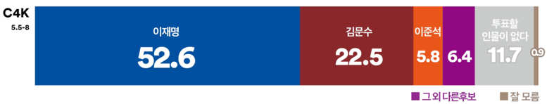 경제활동계층에서도 ‘이재명’이 강세를 보였다. 자영업층(58.8%), 화이트칼라층(60.2%), 블루칼라층(52.2%) 등 주요 직업군에서 과반 이상이 ‘이재명’을 지지했다.