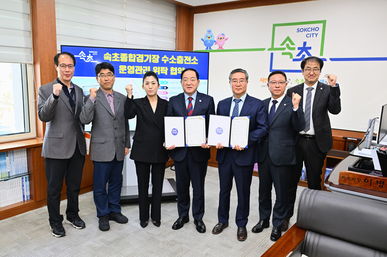 이병선 속초시장과 김태균 속초시시설관리공단 이사장은 3월 28일, 시장 집무실에서 속초종합경기장 수소충전소의 차질 없는 사업 추진을 위해 위탁협약을 체결했다.