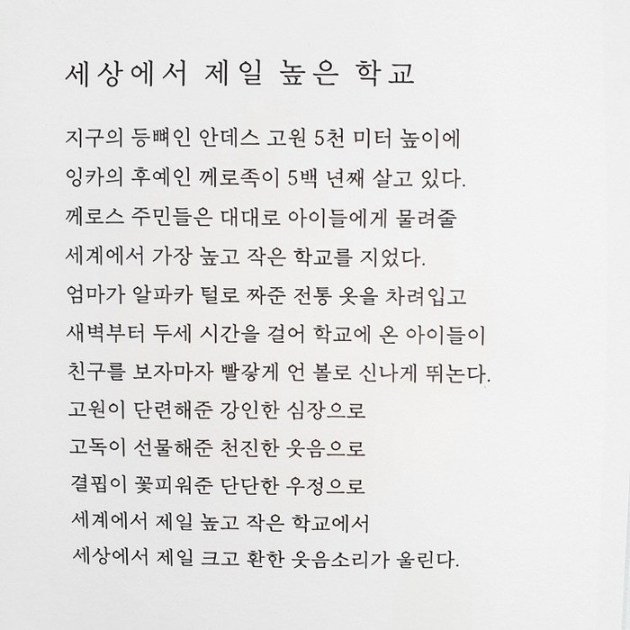 세상에서 제일 높은 학교는 명문대(SKY대)가 아니다. 맑은 하늘을 바라보며 함께 손을 잡고 뛰놀 수 있는 자연이 진정 세상에서 가장 높은 학교다.
