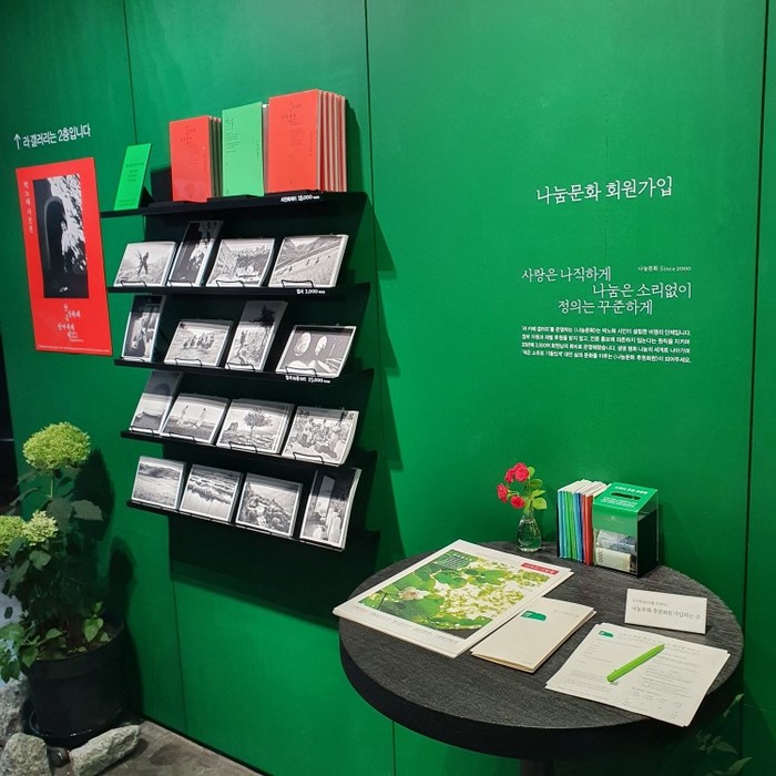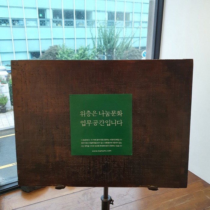 전시장과 카페가 함께 있다. 2층에서 전시를 관람하고 1층에서 전시에 대해 얘기를 나누고 책을 읽는 동선이다. 카페에서는 나눔문화를 후원하거나, 이번 전시과 관련된 기획 상품들을 구매할 수 있다.