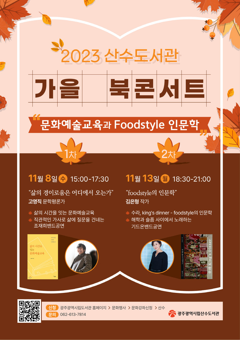 행사 참여는 광주시립도서관 누리집(문화행사/문화강좌신청/산수)으로 신청하면 되며, 기타 자세한 내용은 산수도서관(062-613-7814)로 문의하면 된다.