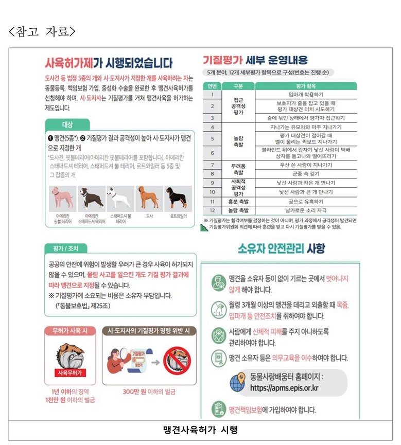 지난 2024년 4월 개정된 ‘동물보호법’에 따라 맹견*소유자는 동물등록, 중성화수술, 책임보헙 가입 등을 사전에 완료하고 계도기간인 오는 10월 26일까지 반드시 맹견사육허가를 받아야 한다.