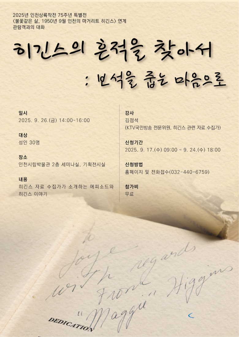 김태익 인천시 시립박물관장은 “전설적인 종군기자의 흔적을 찾고자 한 수집가의 노력이 빛을 발하는 강연이 될 것”이라며 “많은 시민들이 히긴스를 기억하는 계기가 되길 바란다”라고 말했다.