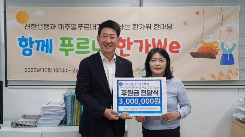 [인천 세계타임즈=심하린 기자] 인천시사회서비스원 소속 미추홀푸르내는 신한은행 인천금융센터로부터 추석 맞이 후원금을 전달받았다고 2일 밝혔다.