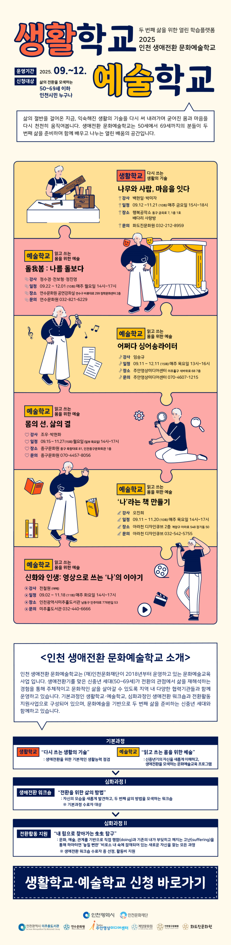 ‘2025 인천 생애전환 문화예술학교-생활학교·예술학교’는 생애전환기를 맞은 신중년이 자신의 삶을 재해석하고 주체적·문화적인 삶을 살아갈 수 있도록 지원하는 열린 학습 플랫폼이다. ‘다시 쓰는 생활의 기술, 읽고 쓰는 몸을 위한 예술’을 주제로 생활학교(목공) 1개 과정과 예술학교(연극, 음악, 미술, 문학, 영상) 5개 과정이 인천광역시미추홀도서관, 연수문화원, 인천중구문화원, 계양문화원, 화도진문화원, 주안영상미디어센터와 협력으로 진행되며, 만 50세~69세 인천시민 누구나 신청할 수 있다.