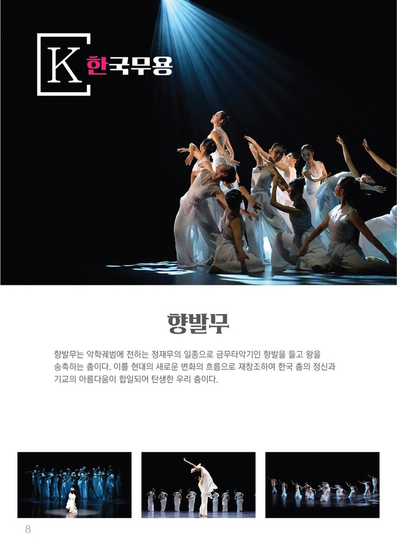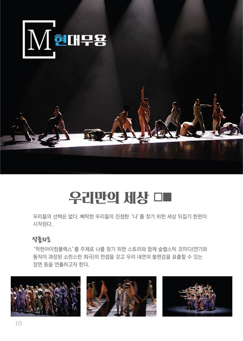 한국무용은 이동안 선생의 ‘태평무’와‘진쇠춤’을 합쳐 재연출한 ‘태평진쇠무’와 금무타악기인 향발을 들고 왕을 송축하는 ‘향발무’를 새롭게 재구성하여 선보일 예정이다. 발레는 마리우스 프티파가 안무한 ‘해적’의 3막을 다채롭게 재구성하여 아름담고 화려한 무대를 선보인다. 또한, 현대무용은 ‘우리만의 세상’을 통해 학생들이 ‘나’를 찾아가는 과정을 진지하고 또 때로는 코믹하게 연출하여 자유분방하고 다양한 몸짓을 선보일 예정이다.