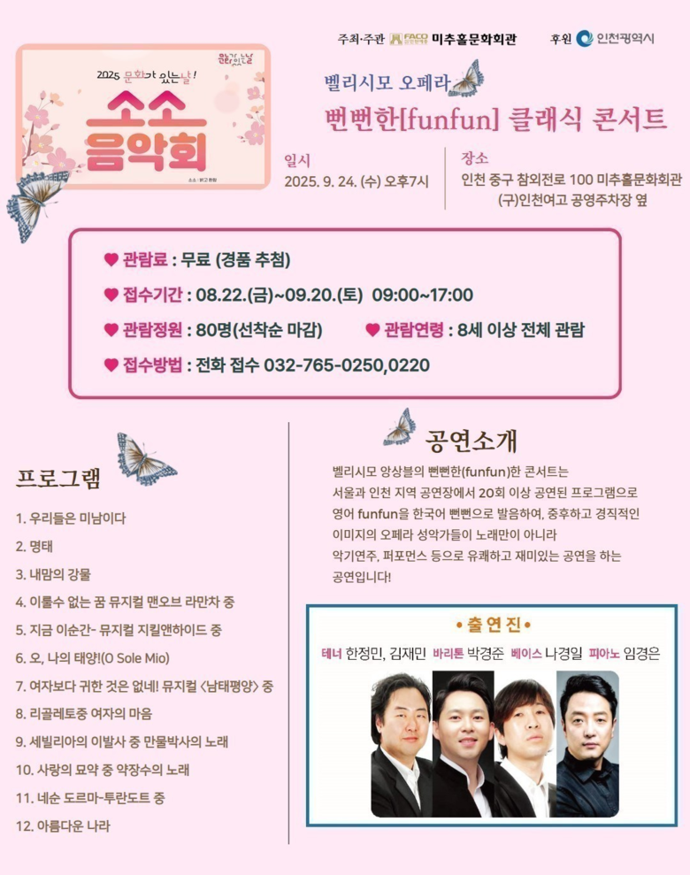 - 시민 일상 속 문화 향유 기회 확대 … 오페라로 유쾌하게 풀어낸 특별 무대 마련 - [인천 세계타임즈=심하린 기자] 인천광역시(시장 유정복)는 (사)인천예총이 운영하는 미추홀문화회관에서(중구 참외전로 100) 오는 9월 24일(수) 오후 7시 ‘소소음악회’를 개최한다고 밝혔다.
