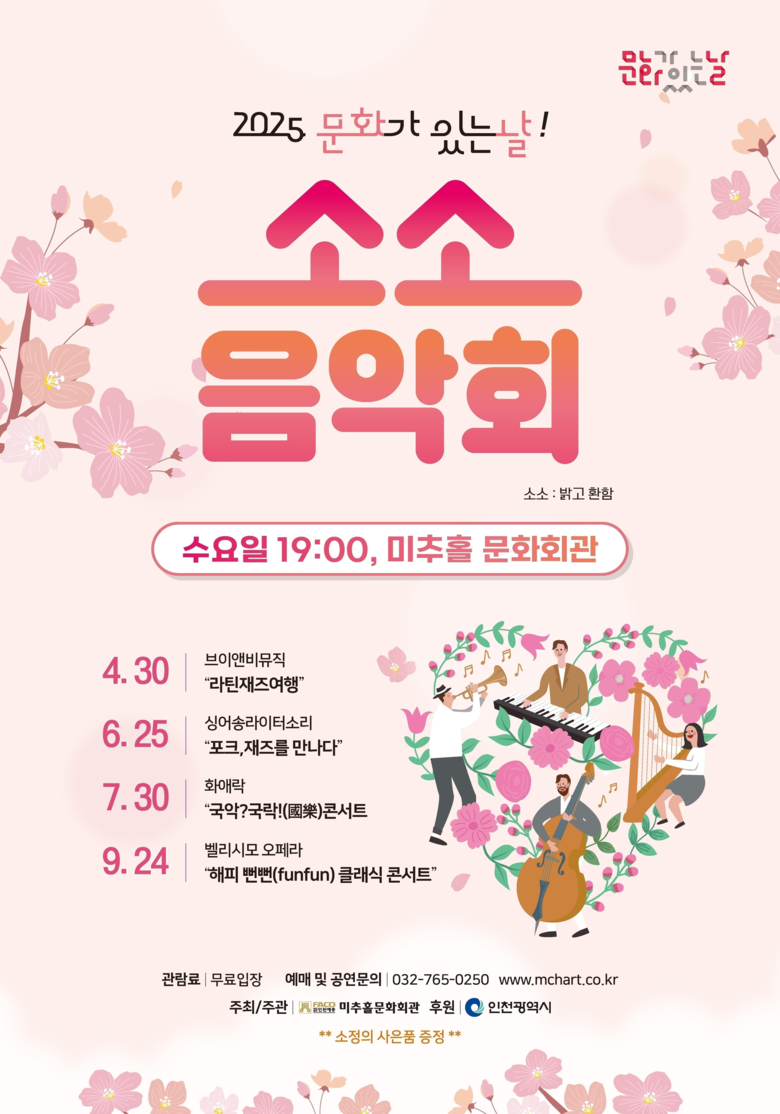 ‘소소음악회’는 인천 시민이라면 누구나 무료로 관람할 수 있으며, 자세한 일정과 내용은 미추홀문화회관 누리집(www.mchart.co.kr)에서 확인할 수 있다.