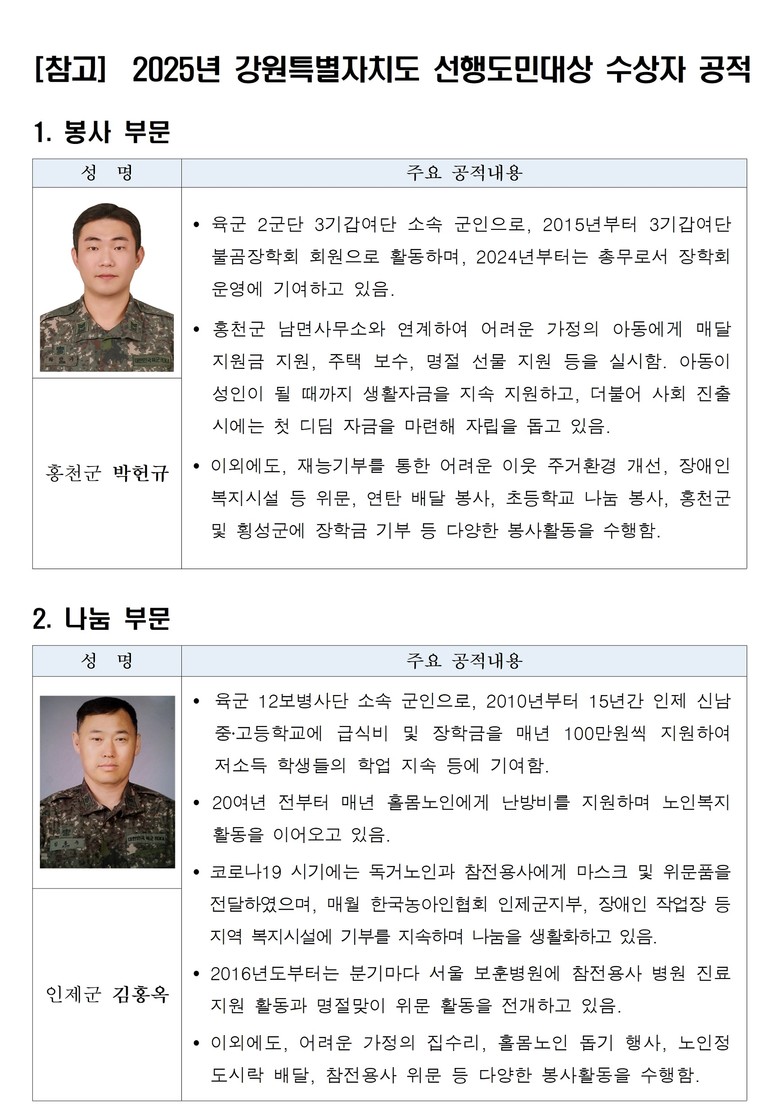 한편, 강원특별자치도는 1997년부터 매년 ‘선행도민대상’을 운영해 미풍양속의 계승과 발전, 그리고 건전한 사회 분위기 조성에 기여해왔으며, 앞으로도 다양한 분야에서 선행을 실천하는 모범 도민을 지속 발굴해 나갈 계획이다.