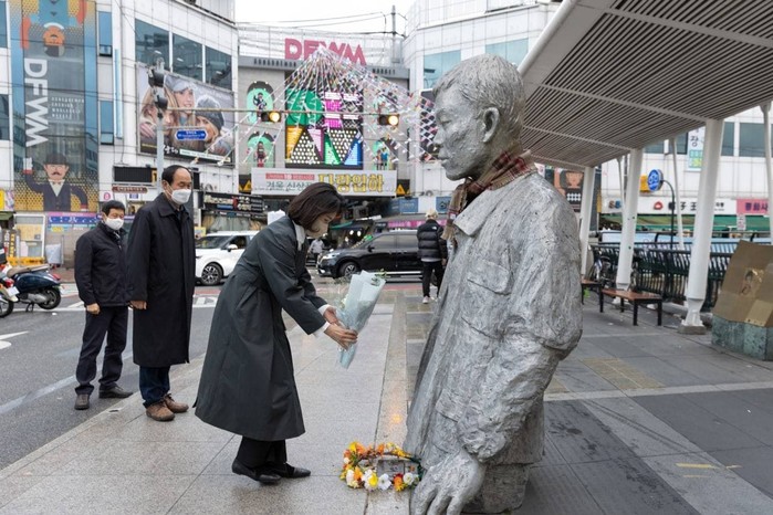 관람을 마친 김혜경 씨는 전태일 다리(버들다리)로 이동해서, 전태일재단 이수호 이사장, 한석호 사무총장, 전태일 기념관 오동진 관장을 만나 열사의 분신 항거 장소를 둘러보고 열사의 동상 앞에 헌화하고 묵념했다.