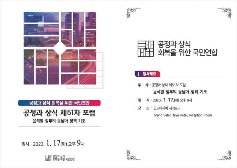 [세계타임즈 백진욱 기자] 지난 1월 17일 우리나라의 자유민주주의와 법치주의, 공정과 상식 회복의 담론을 제기하며 희망과 변화를 위한 공동체적 연대와 행동을 추구해 온 《공정과 상식 회복을 위한 국민연합》의 동남아 본부장인 김수일 인도네시아 국립대 교수(전 동티모르대사)가 “윤석열 정부의 인도-태평양 전략”을 주제로 인도네시아 국회의사당에서 강연을 했다. 자카르타에서 열린 이번 제51차 포럼에는 인도네시아 뿌안 마라하니 국회의장을 대신해 참석한 아우구스티나 의원과 록민 전 해양수산부 장관, 박재한 재인도네시아 한인회 회장, 이세호 재인도네시아 민주평동 지회장 등, 각계 교민, 한국어 전공 인도네시아 학생들과 공정과 상식 회원등 등 한·인니 양국 인사 100여명이 참석한 가운데 진행되었다.