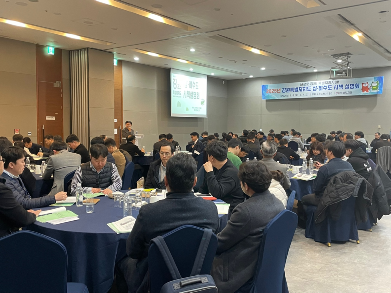 [강원도 세계타임즈=김민석 기자] 강원특별자치도(도지사 김진태, 이하 ‘도’)는 3월 6일(목), 도민들에게 더욱 안정적인 상·하수도 서비스를 제공하고 지속 가능한 물 관리 정책을 공유하기 위해 ‘2025년 상·하수도 분야 주요 업무 시책 설명회’를 영월군 동강시스타리조트에서 개최했다. 이날 설명회에는 산림환경국장을 비롯해 한국수자원공사, 시·군 상·하수도 사업소장(과장) 등 약 100명이 참석했다.