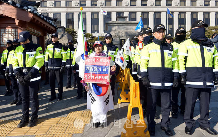 박근혜 대통령 탄핵심판 최종변론기일인 27일 오전 서울 종로구 헌법재판소 앞에서 경찰이 경계근무를 서는 가운데 한 시민이 계엄령 선포를 촉구하며 1인 시위를 하고 있다. 2017.02.27.