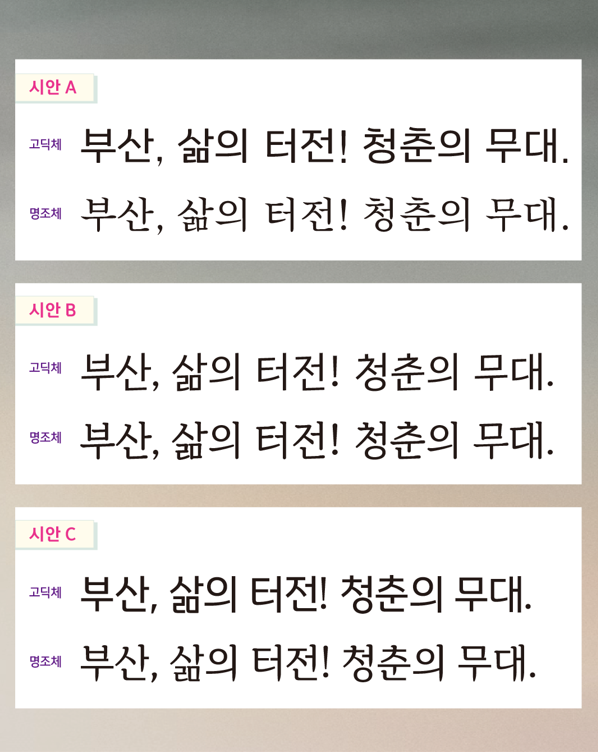 ◈ 시, 선호도 조사 결과를 반영해 전용 서체를 개발하고, 향후 ▲공공디자인 전반 ▲시정 홍보물 ▲국제 교류 [부산 세계타임즈=이용우 기자] 부산시(시장 박형준)는 도시브랜드 정체성을 강화하고 공공디자인 품질을 높이기 위해 시민과 공무원을 대상으로 「부산 도시브랜드 전용 서체 개발」 선호도 조사를 실시한다고 밝혔다.