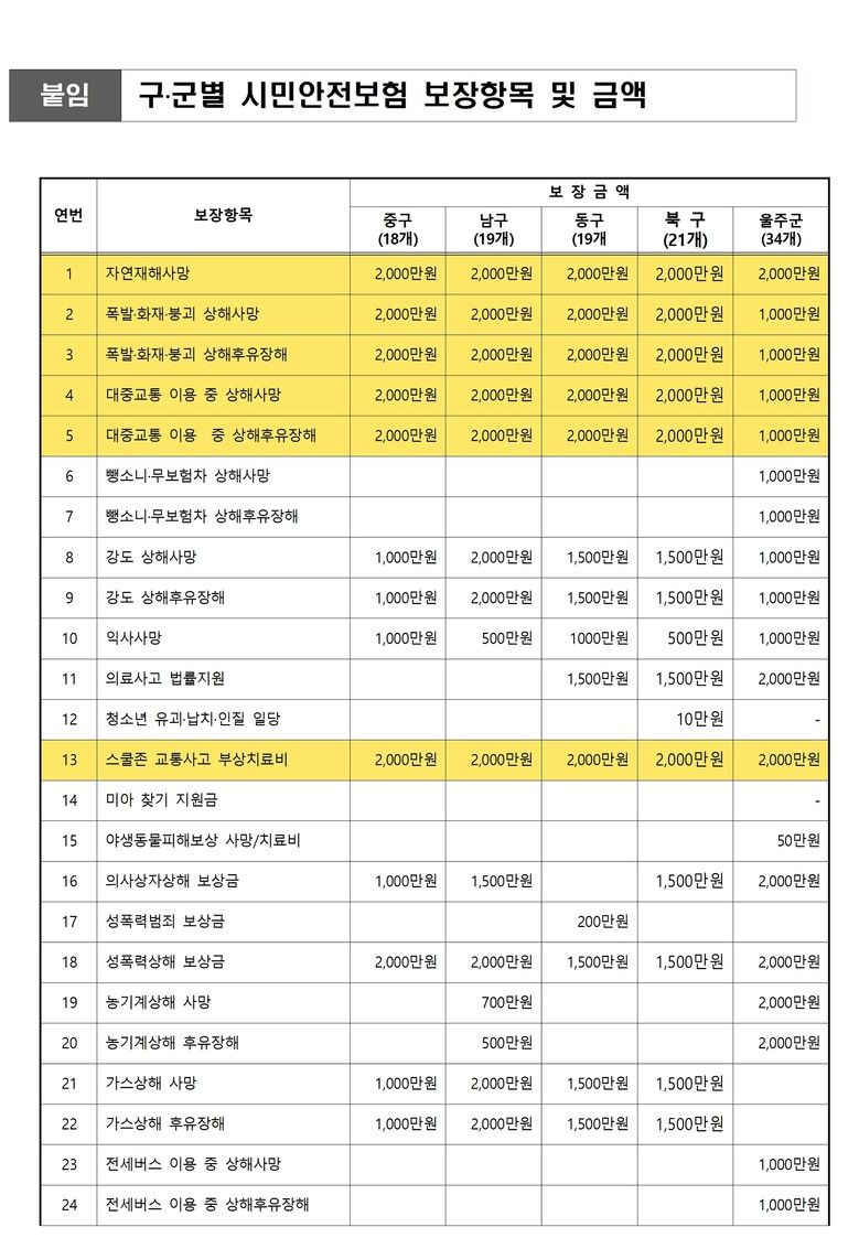 보상 대상자는 울산시에 주민등록이 되어 있는 시민으로 별도의 가입 절차 없이 자동으로 보험에 가입된다.