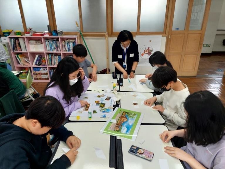 ‘알쏭달쏭 퍼즐로 풀어보는 피란수도 부산’은 4~6명이 함께하는 모둠활동으로, 종이에 있는 퀴즈를 풀고 딱지를 접어서 퍼즐판의 그림을 완성하는 체험활동이다.