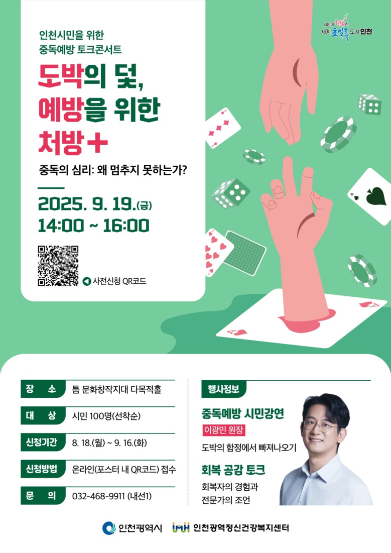 박미애 시 건강증진과장은 “이번 강연이 도박중독의 심각성과 회복 가능성에 대한 시민 인식을 높이는 계기가 되길 바란다”며, “앞으로도 인천시는 청소년을 비롯한 모든 시민이 건강하고 안전한 삶을 살아갈 수 있도록 중독 예방 및 회복 지원 사업을 지속적으로 확대해 나가겠다”라고 밝혔다.